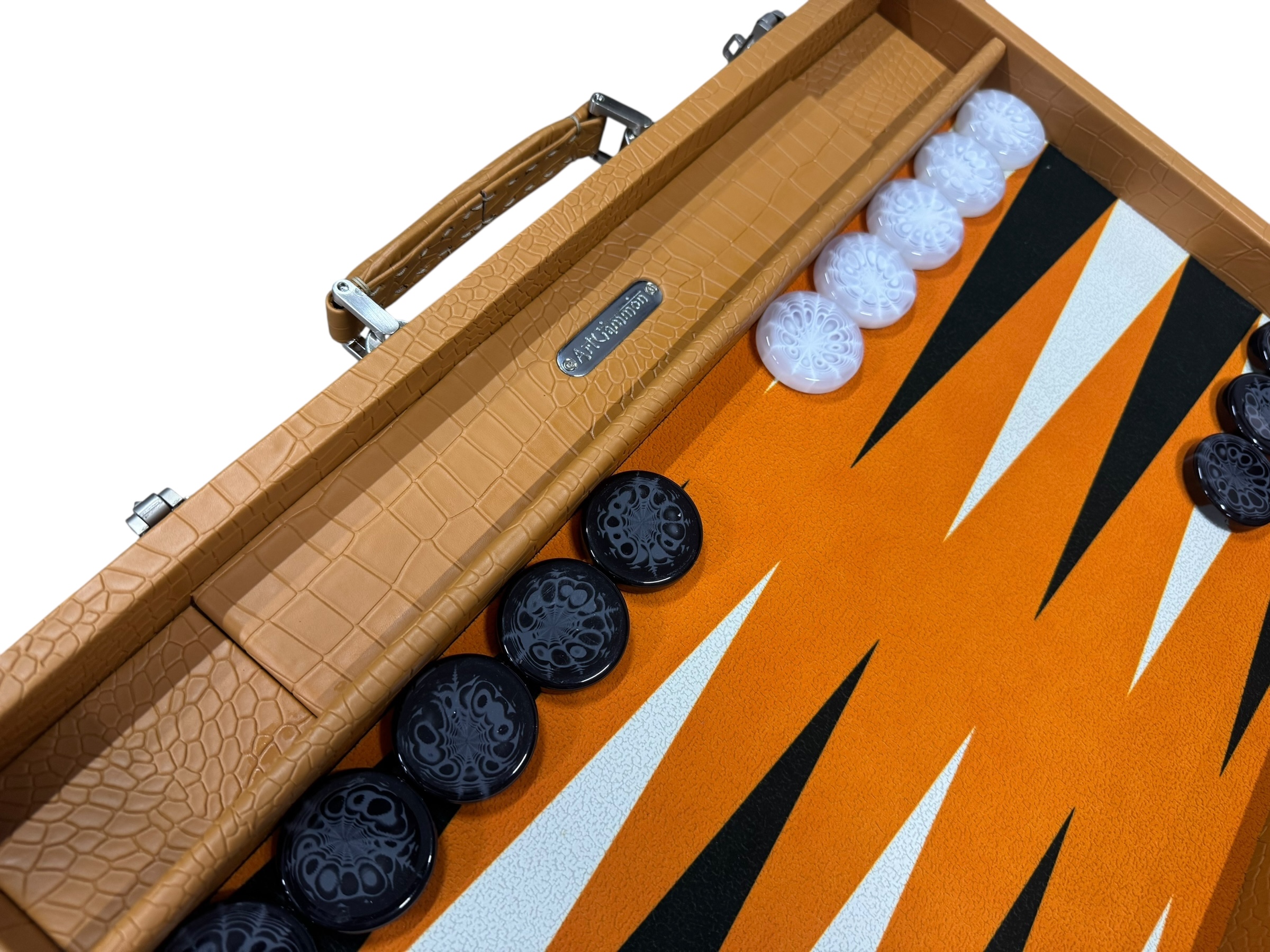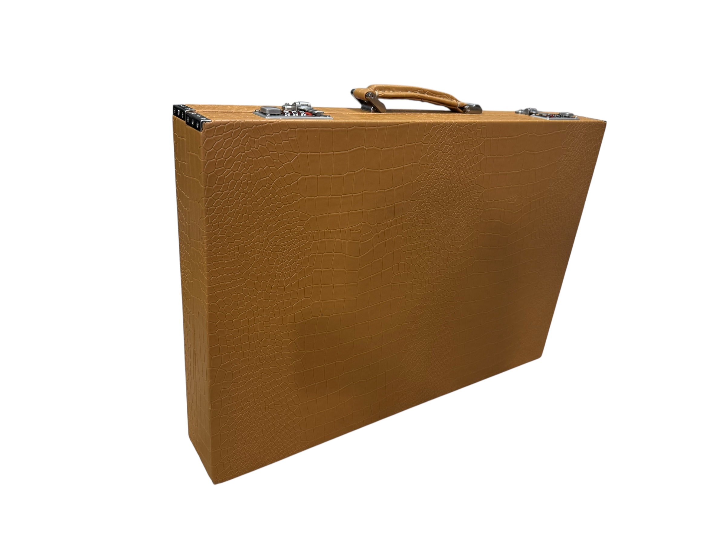 The ArtGammon Camel Brown Croco Backgammon Board showcases a stunning Camel Brown crocodile-patterned exterior that exudes sophistication and luxury. The high-quality material mimics the texture of genuine crocodile leather, giving the board a unique and captivating appearance. This contemporary design is perfect for those who appreciate fine craftsmanship and want a statement piece in their game collection.