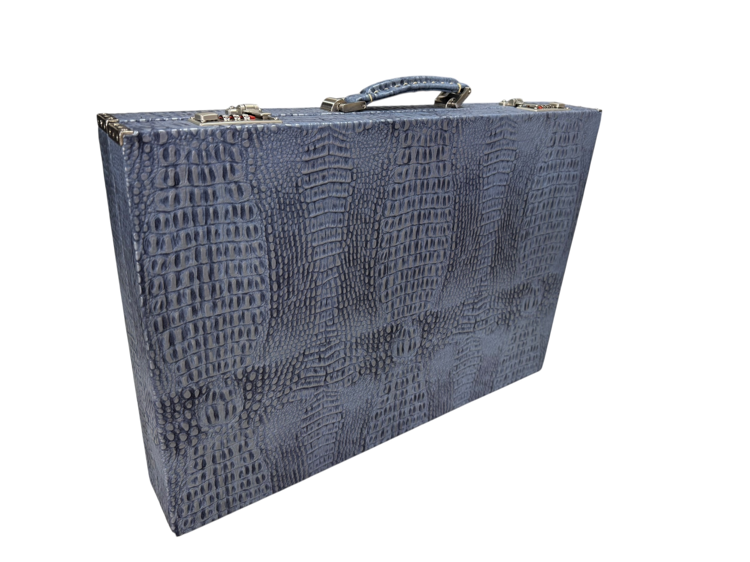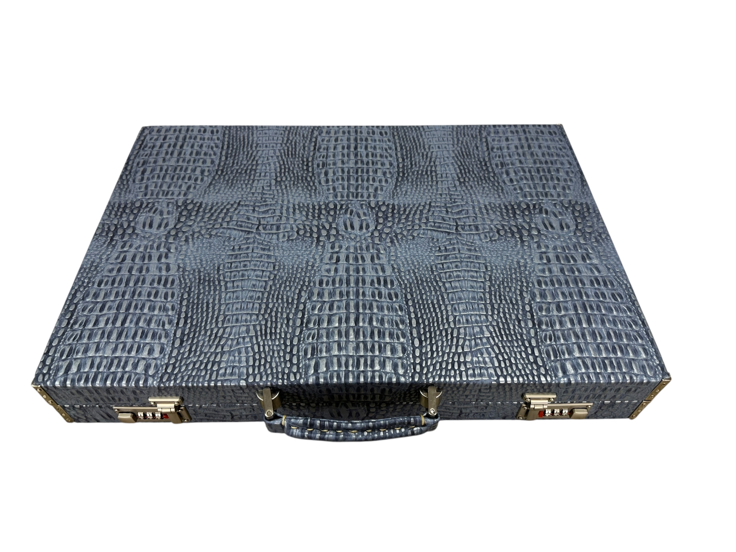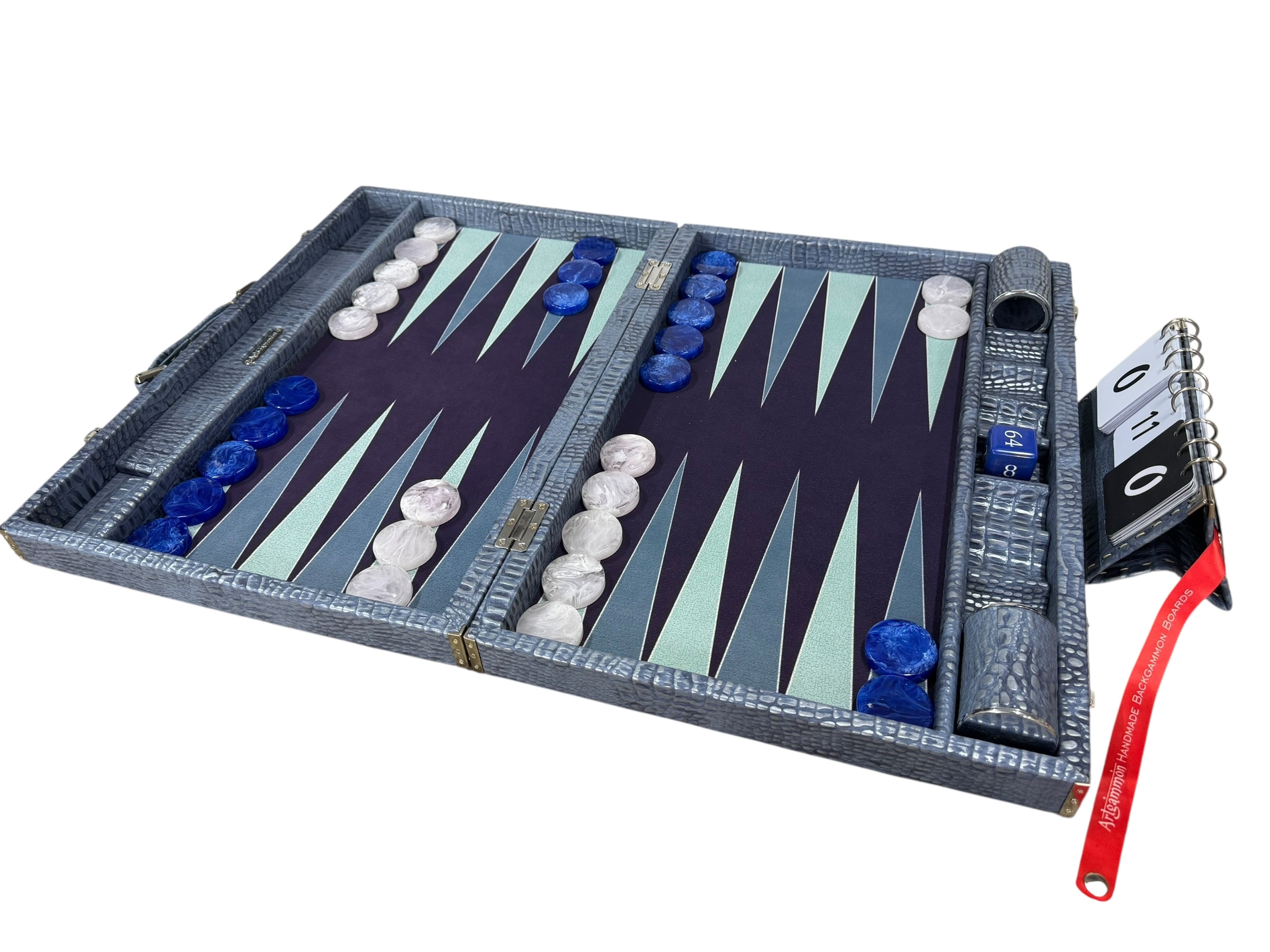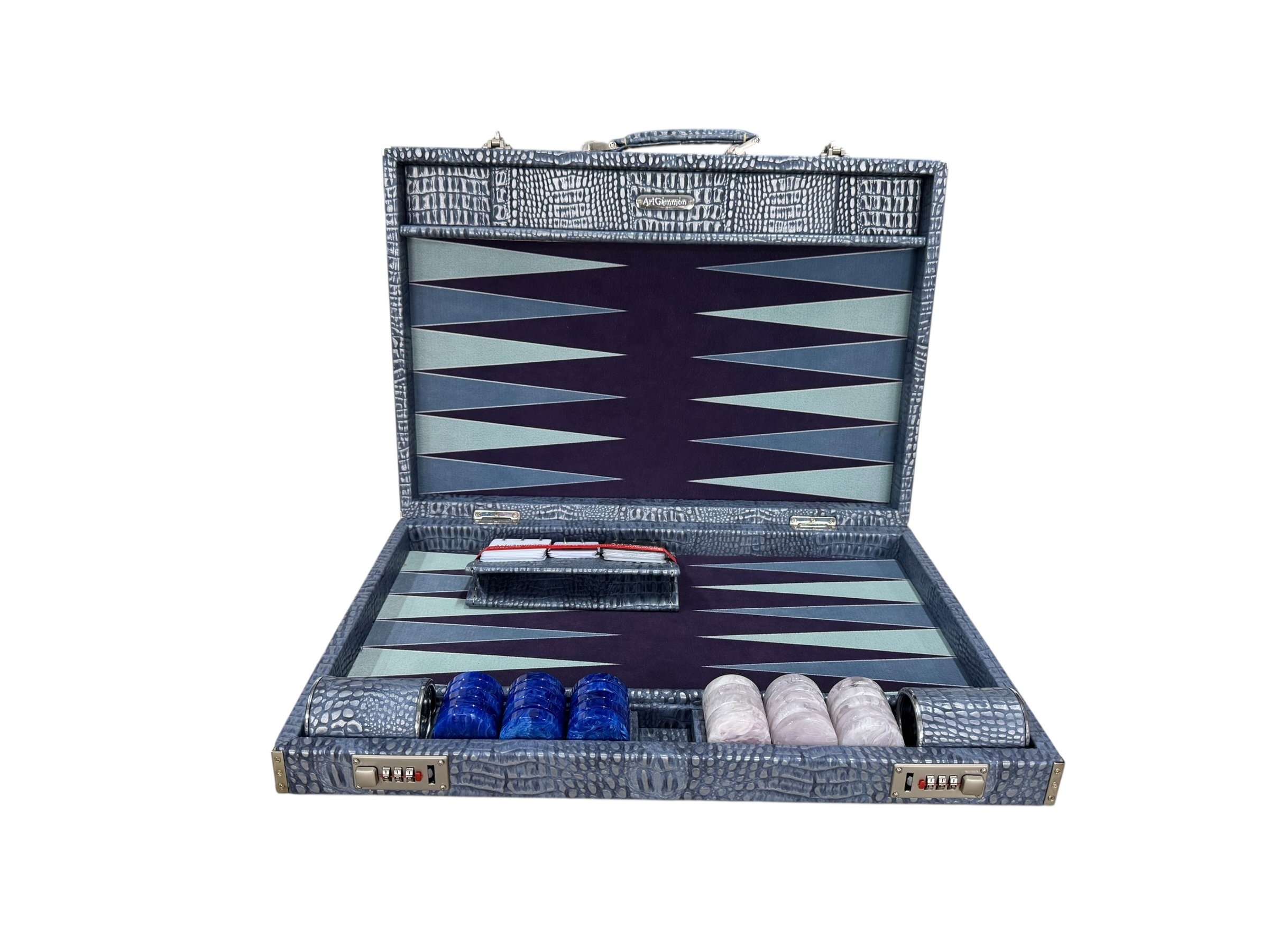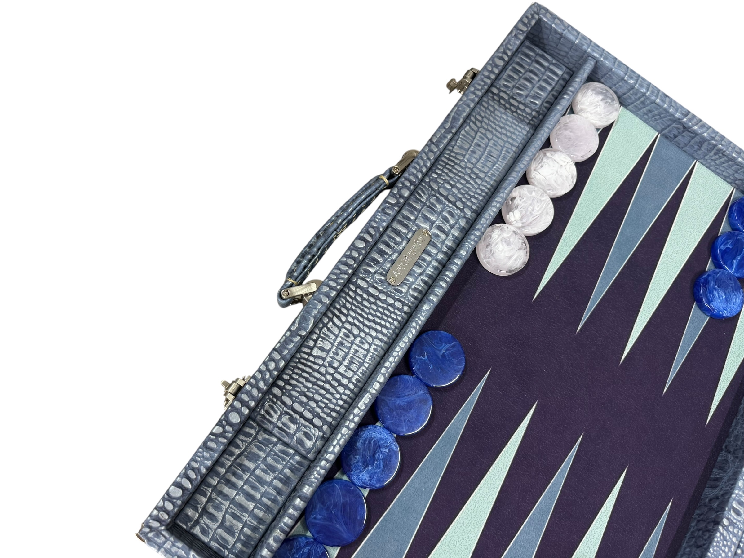 The ArtGammon Blue  Alligator Backgammon Board showcases a stunning Blue Alligator-patterned exterior that exudes sophistication and luxury. The high-quality material mimics the texture of genuine crocodile leather, giving the board a unique and captivating appearance. This contemporary design is perfect for those who appreciate fine craftsmanship and want a statement piece in their game collection.