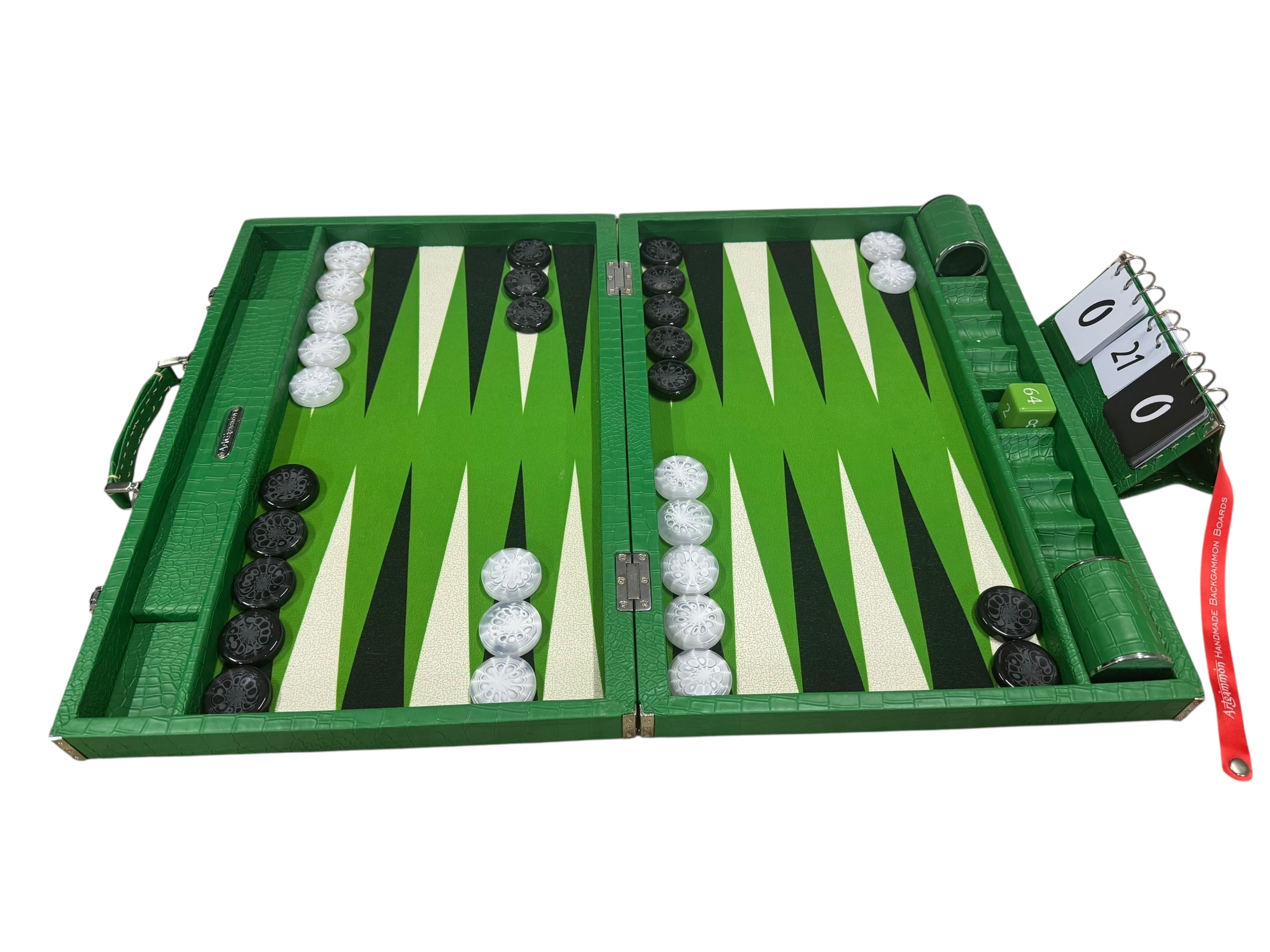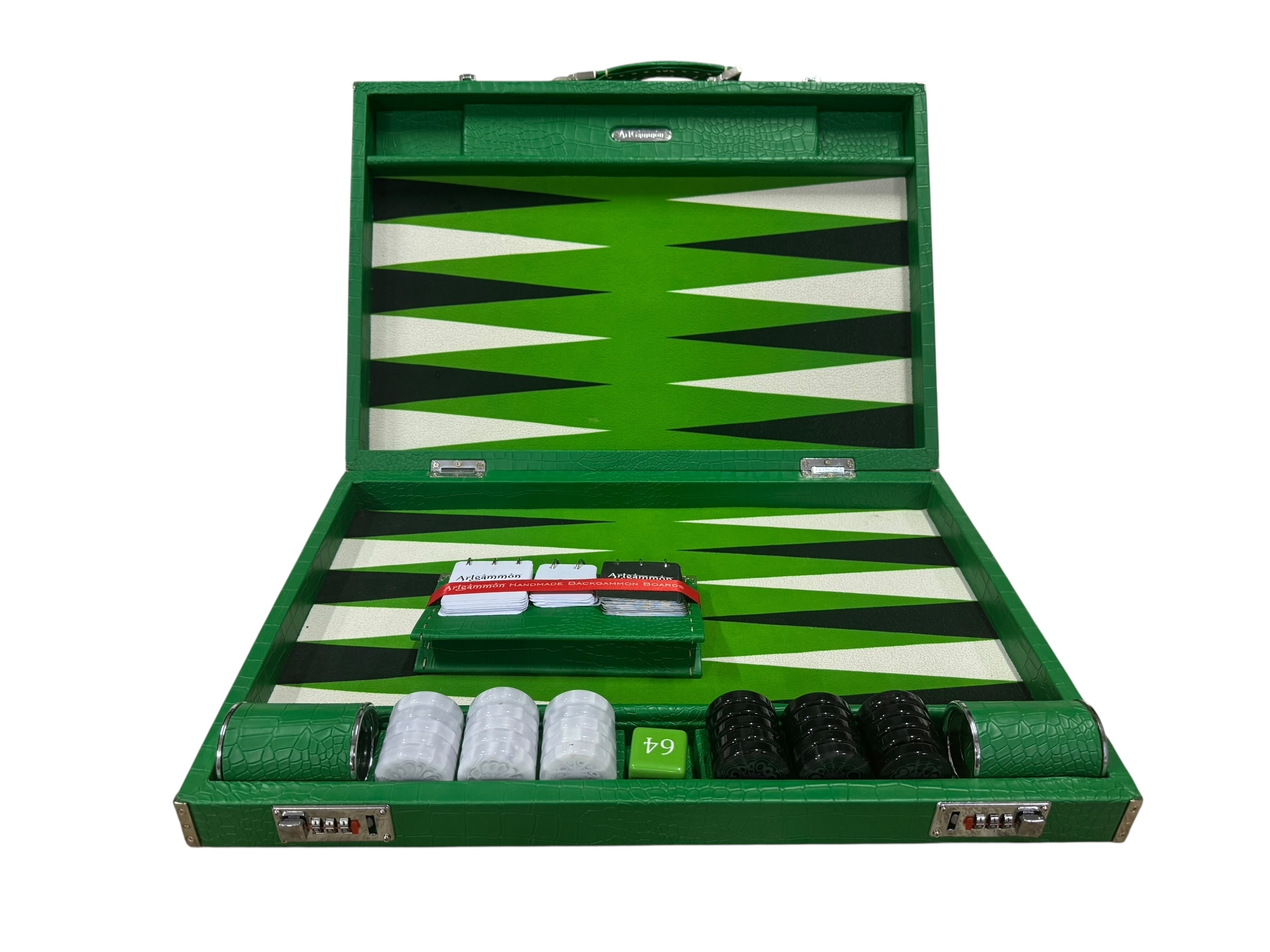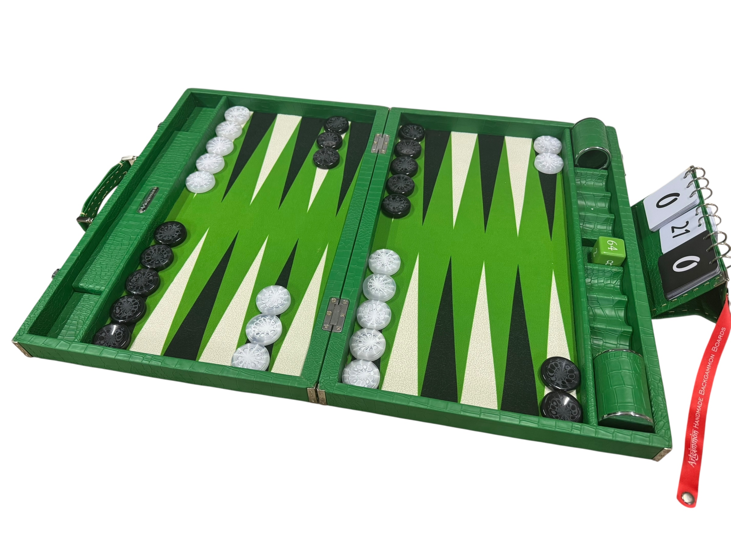 The ArtGammon Green Croco Backgammon Board is equipped with several thoughtful features to enhance your gaming experience:Open dimensions: 73 x 54 cm (28,7 x 21 inches)Closed dimensions: 36,5 x 54 cm (14,3 x 21 inches)