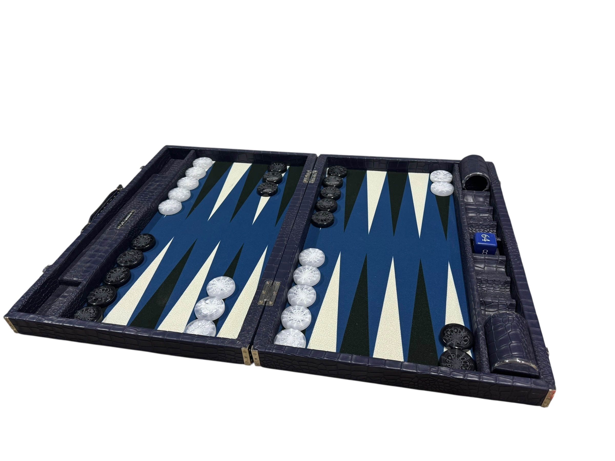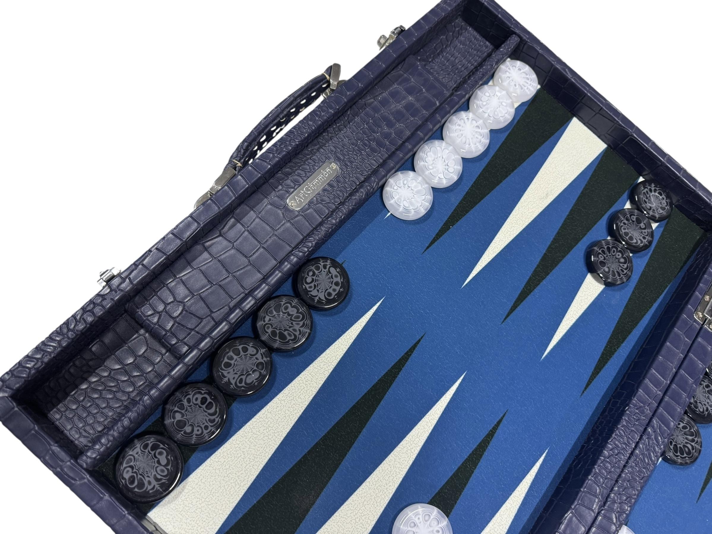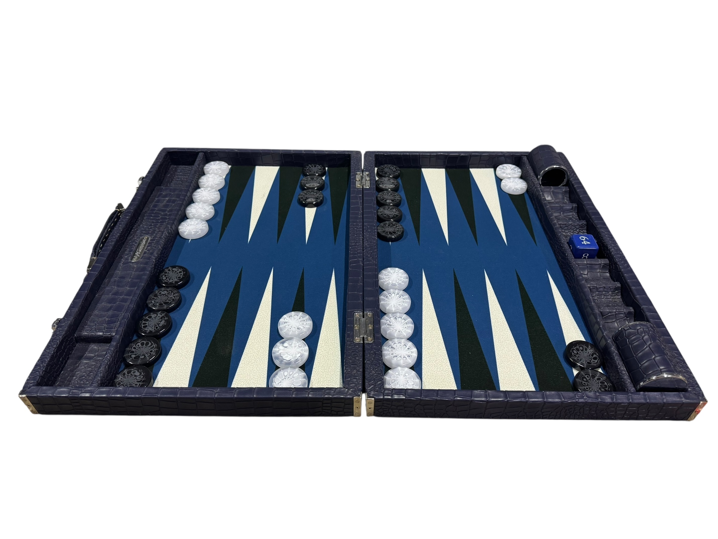 The ArtGammon Navy Blue Croco Backgammon Board showcases a stunning Navy Blue crocodile-patterned exterior that exudes sophistication and luxury. The high-quality material mimics the texture of genuine crocodile leather, giving the board a unique and captivating appearance. This contemporary design is perfect for those who appreciate fine craftsmanship and want a statement piece in their game collection.