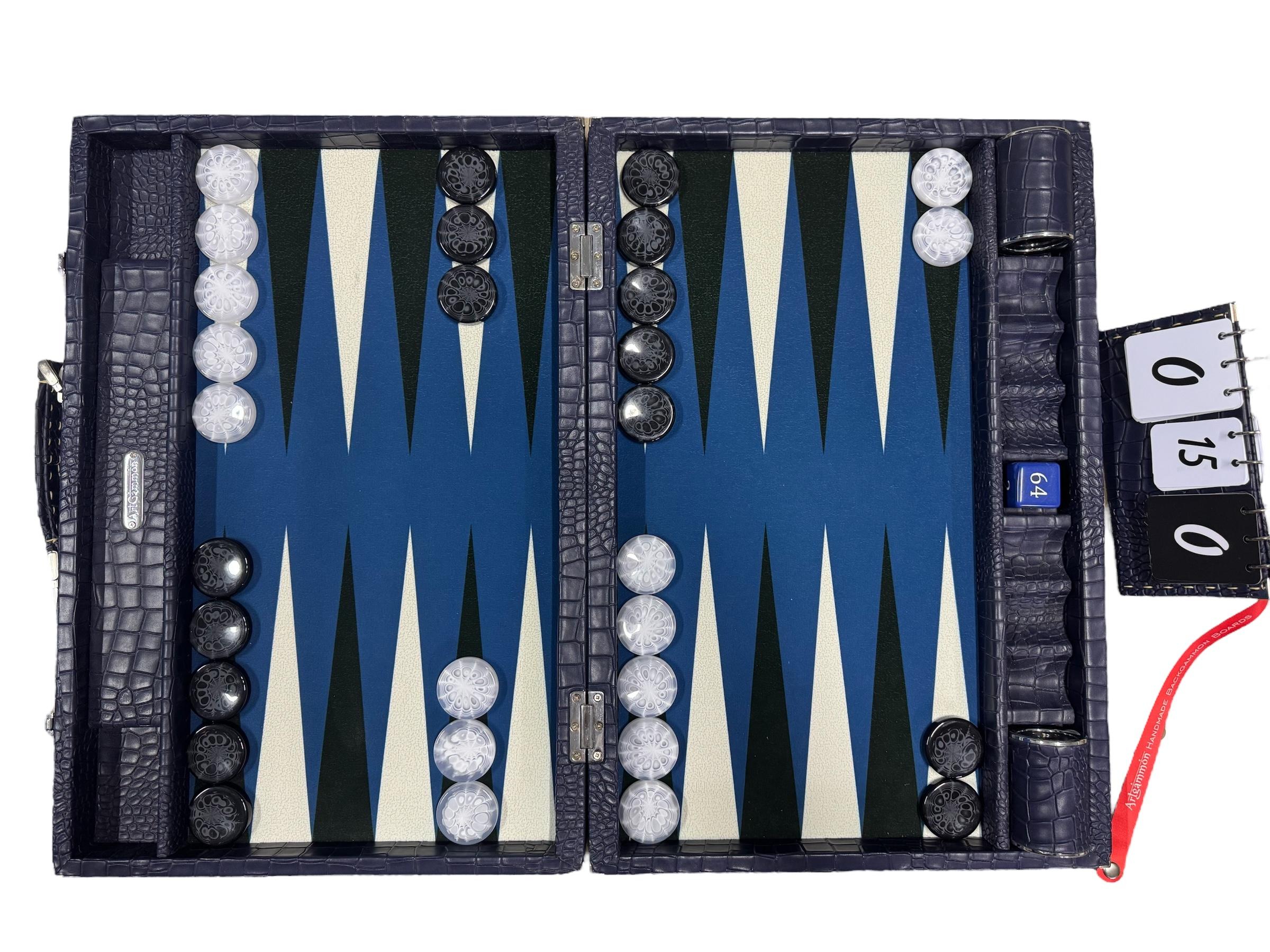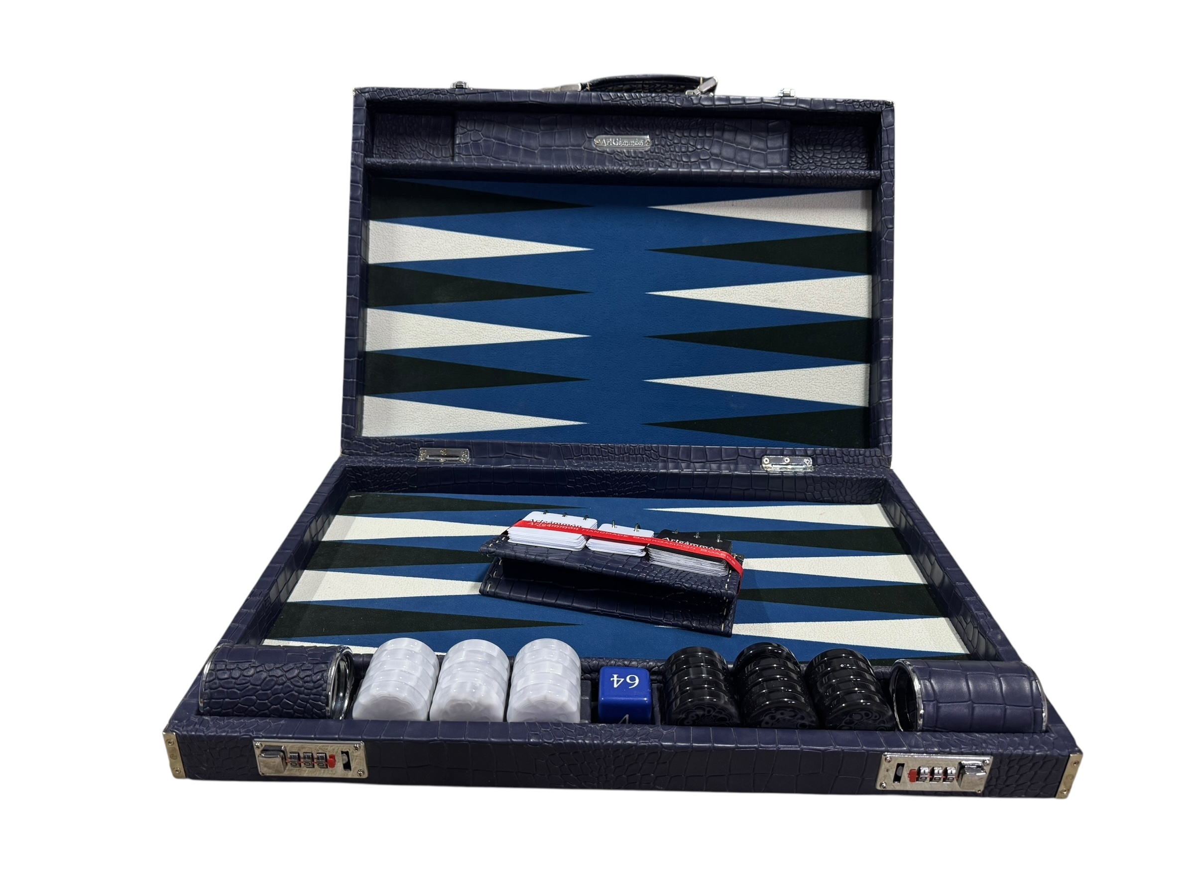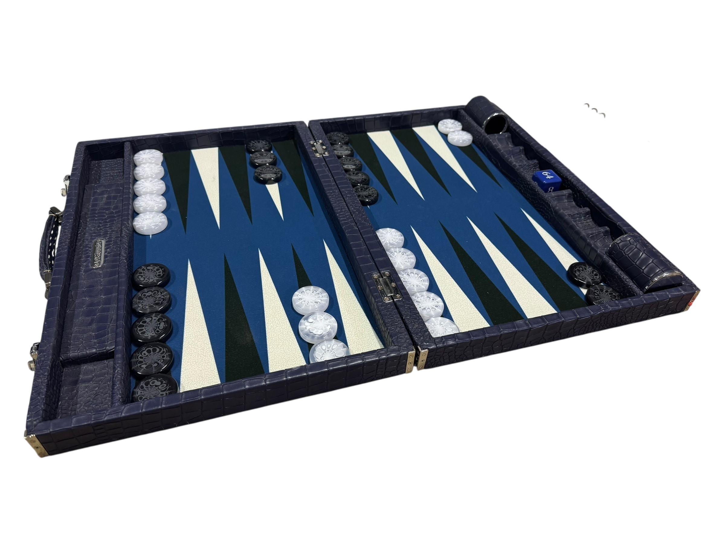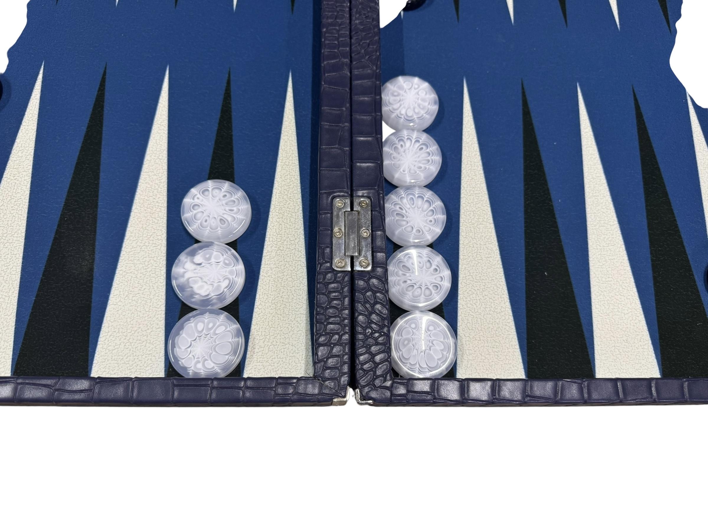 The ArtGammon Navy Blue Croco Backgammon Board showcases a stunning Navy Blue crocodile-patterned exterior that exudes sophistication and luxury. The high-quality material mimics the texture of genuine crocodile leather, giving the board a unique and captivating appearance. This contemporary design is perfect for those who appreciate fine craftsmanship and want a statement piece in their game collection.
