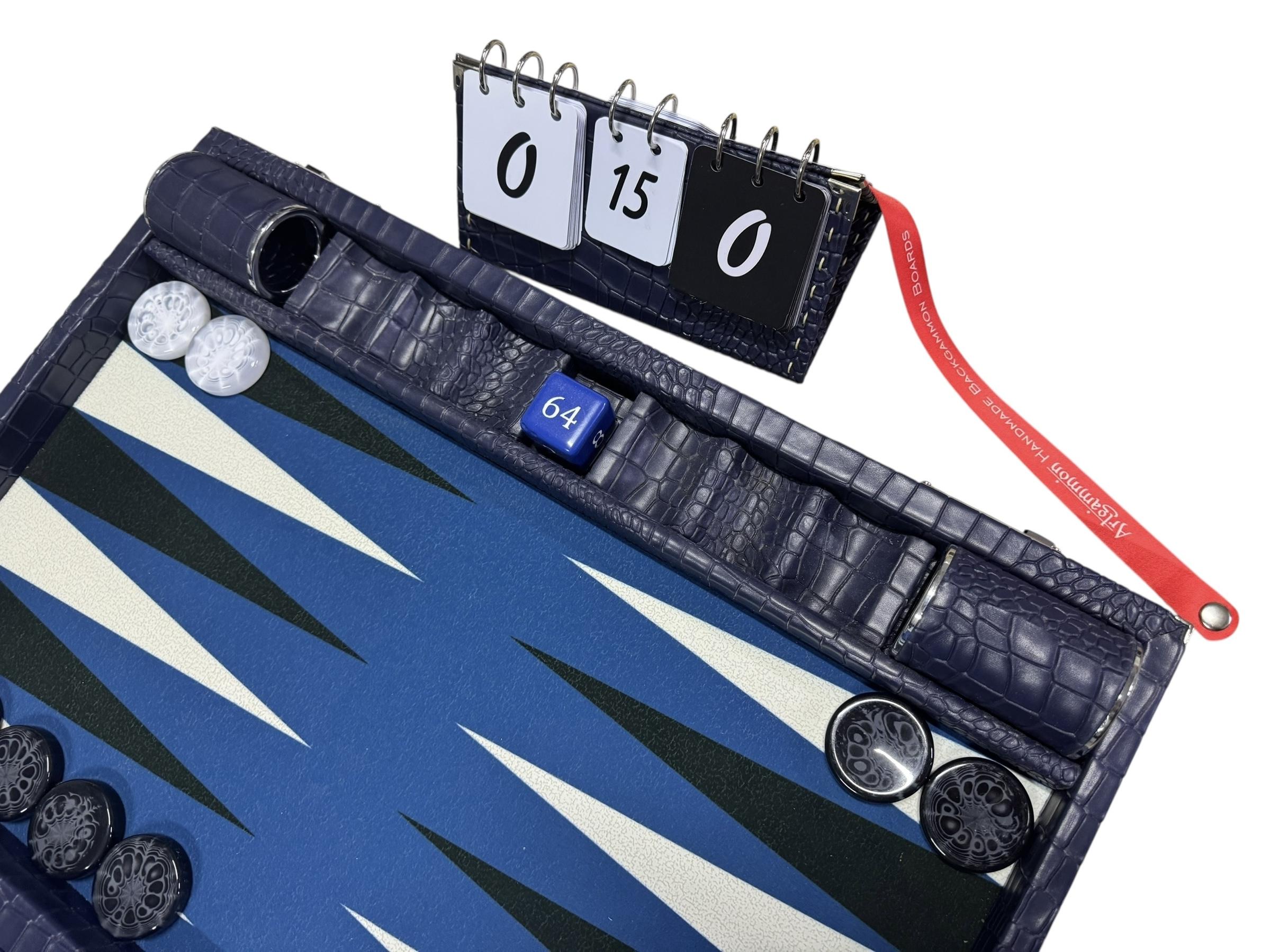The ArtGammon Navy Blue Croco Backgammon Board is equipped with several thoughtful features to enhance your gaming experience:Open dimensions: 73 x 54 cm (28,7 x 21 inches)Closed dimensions: 36,5 x 54 cm (14,3 x 21 inches)