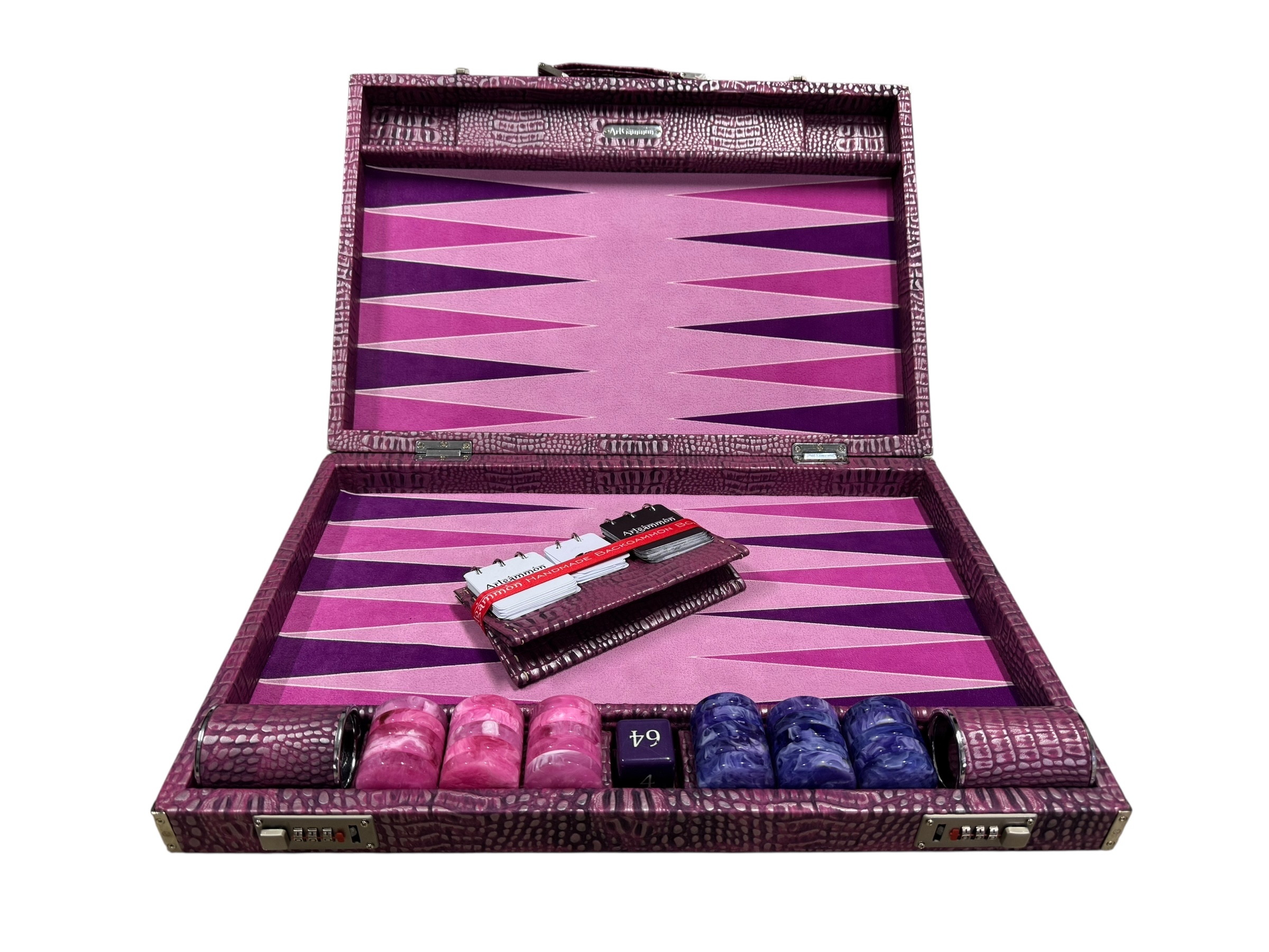 The ArtGammon Pink Alligator Backgammon Board is equipped with several thoughtful features to enhance your gaming experience:Open dimensions: 73 x 54 cm (28,7 x 21 inches) Closed dimensions: 36,5 x 54 cm (14,3 x 21 inches)