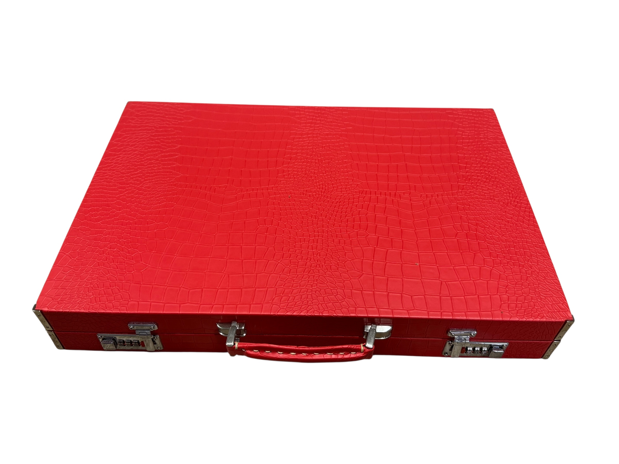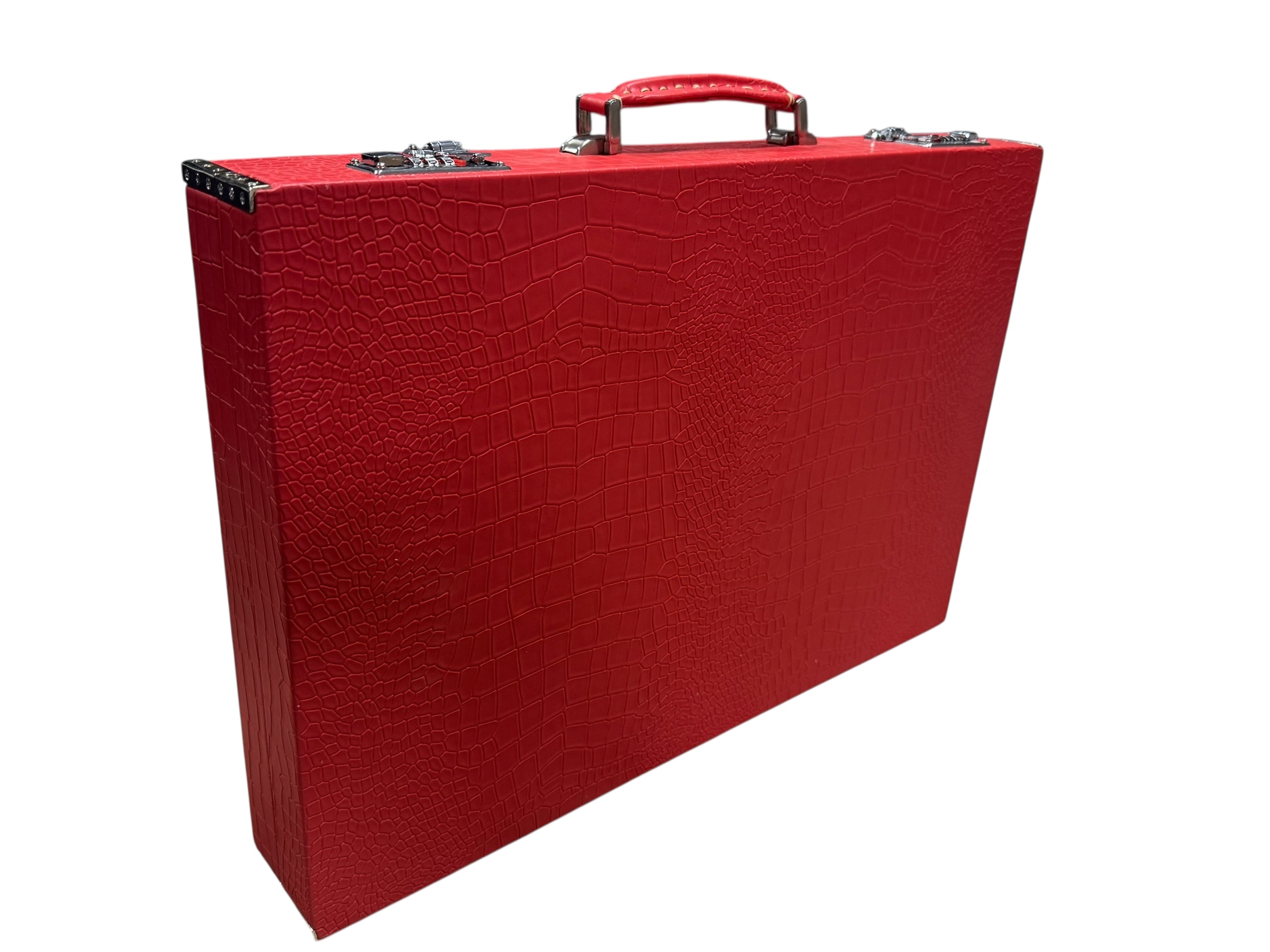 The ArtGammon Scarlet Red Croco Backgammon Board showcases a stunning Scarlet Red crocodile-patterned exterior that exudes sophistication and luxury. The high-quality material mimics the texture of genuine crocodile leather, giving the board a unique and captivating appearance. This contemporary design is perfect for those who appreciate fine craftsmanship and want a statement piece in their game collection.