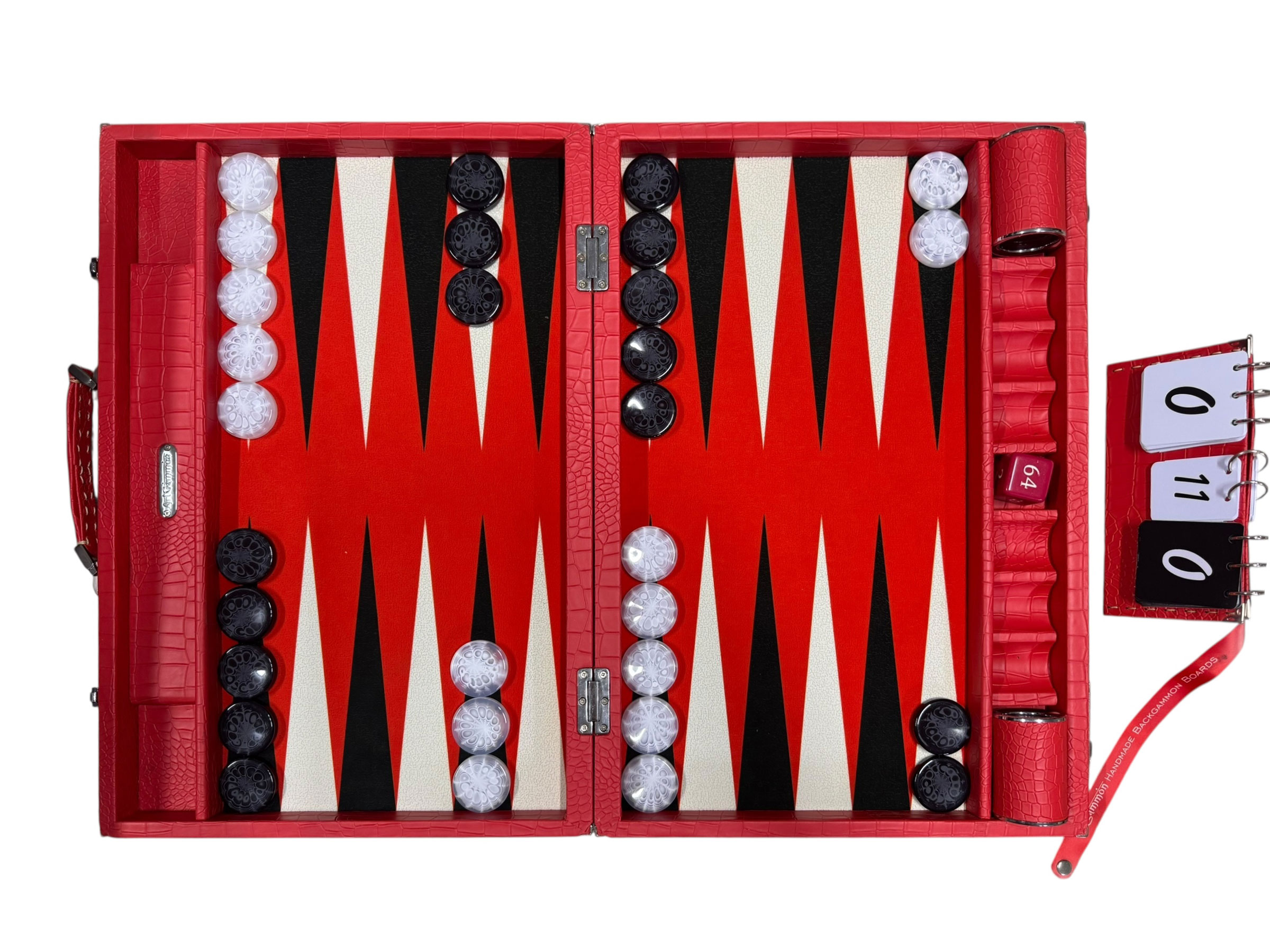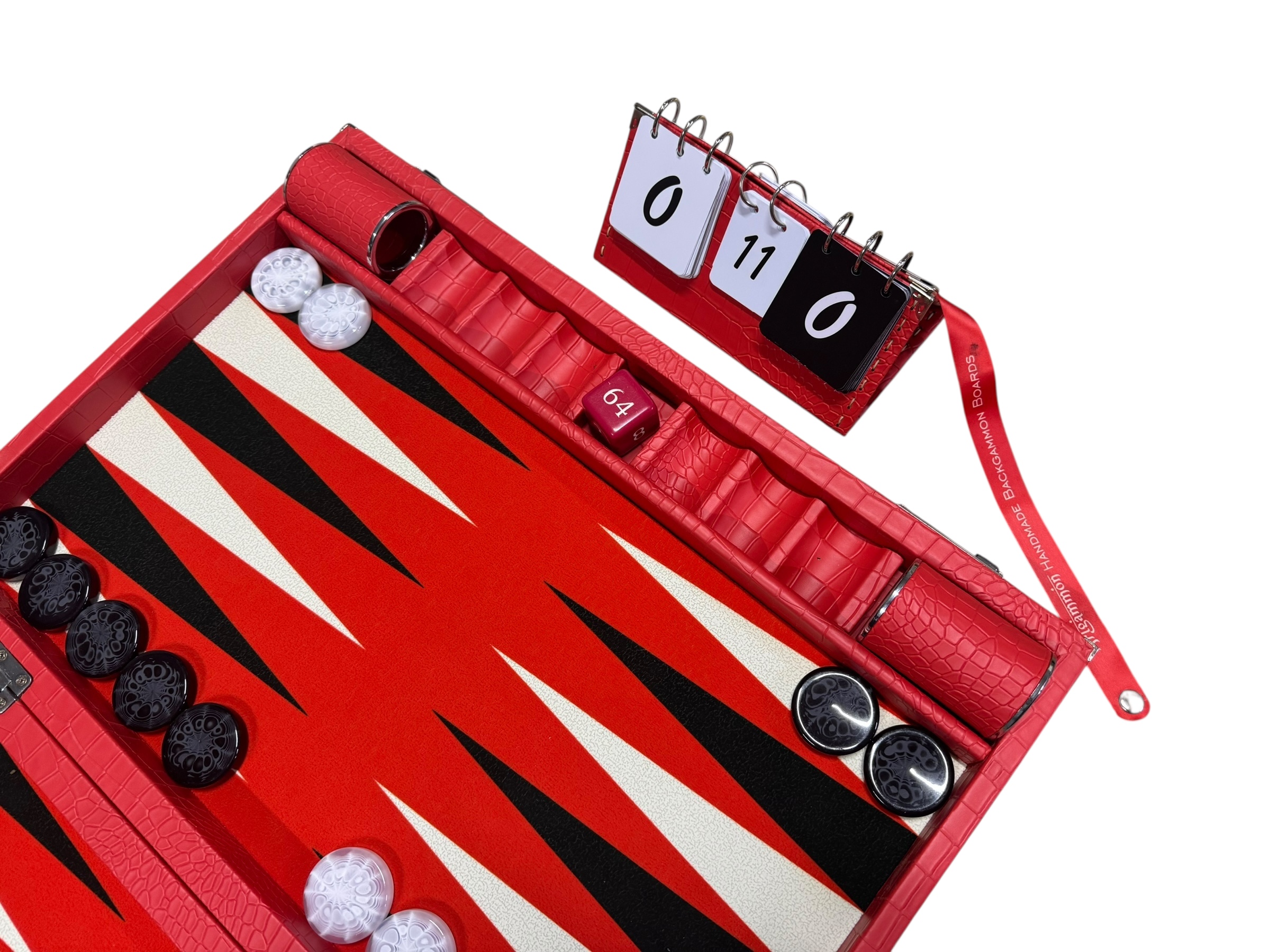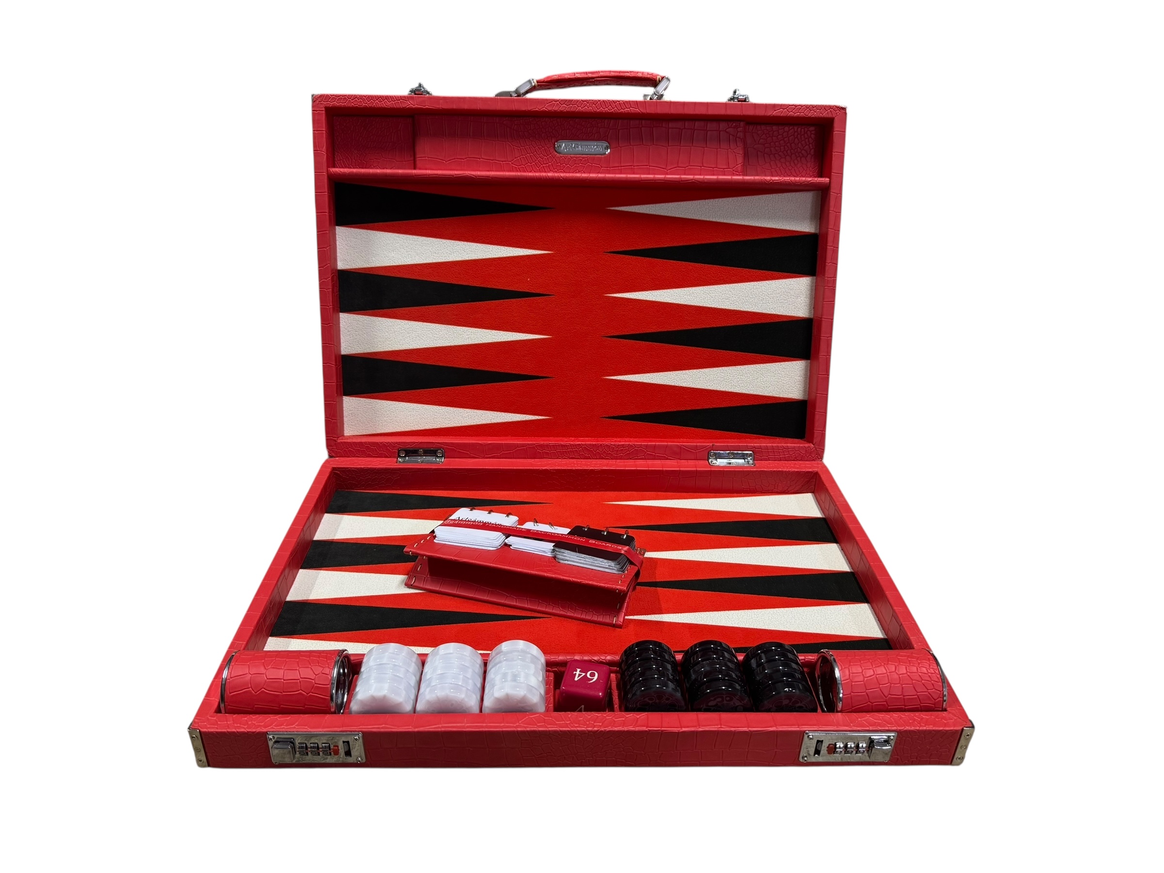The ArtGammon Scarlet Red Croco Backgammon Board is equipped with several thoughtful features to enhance your gaming experience:Open dimensions: 73 x 54 cm (28,7 x 21 inches)Closed dimensions: 36,5 x 54 cm (14,3 x 21 inches)