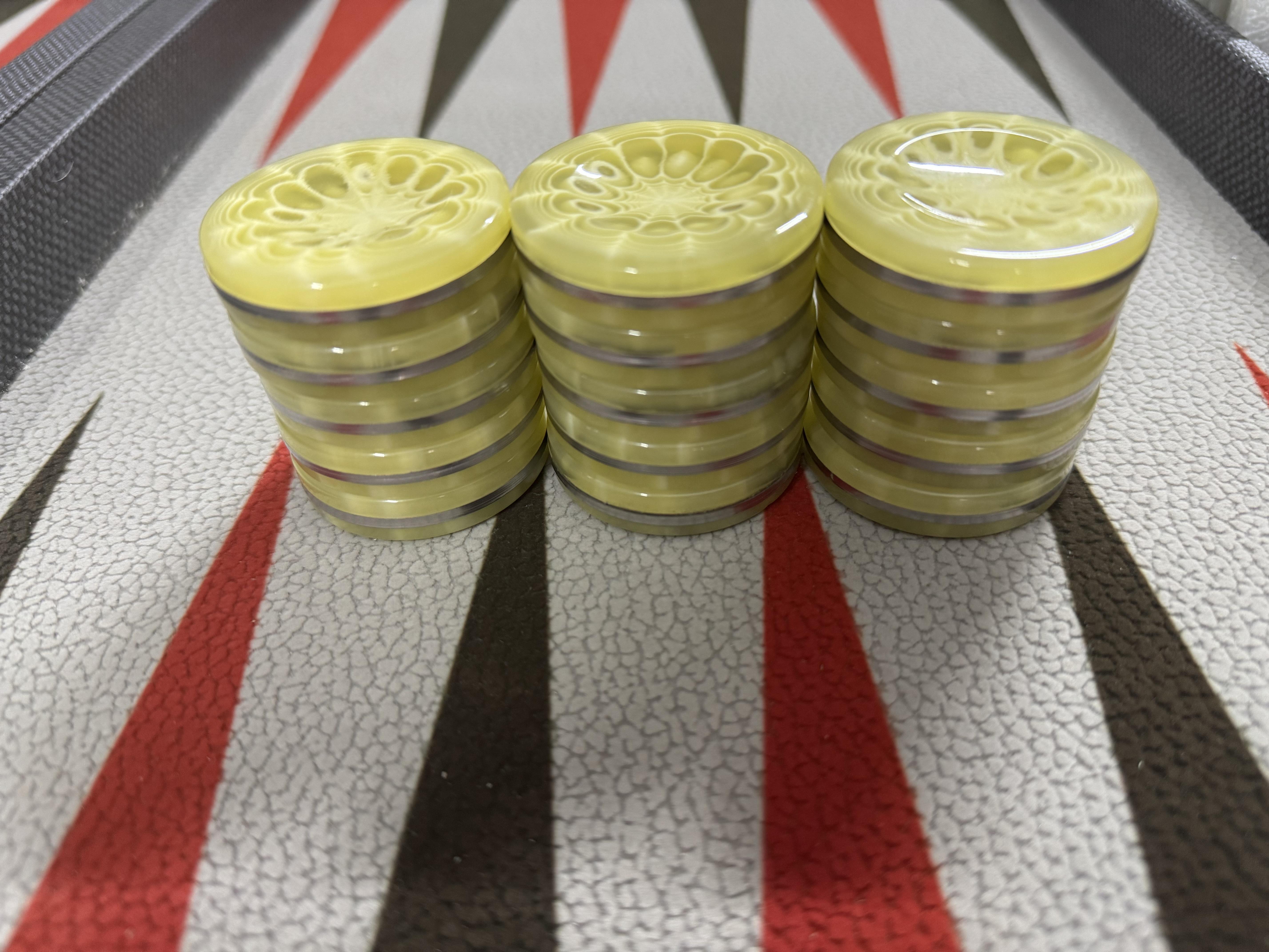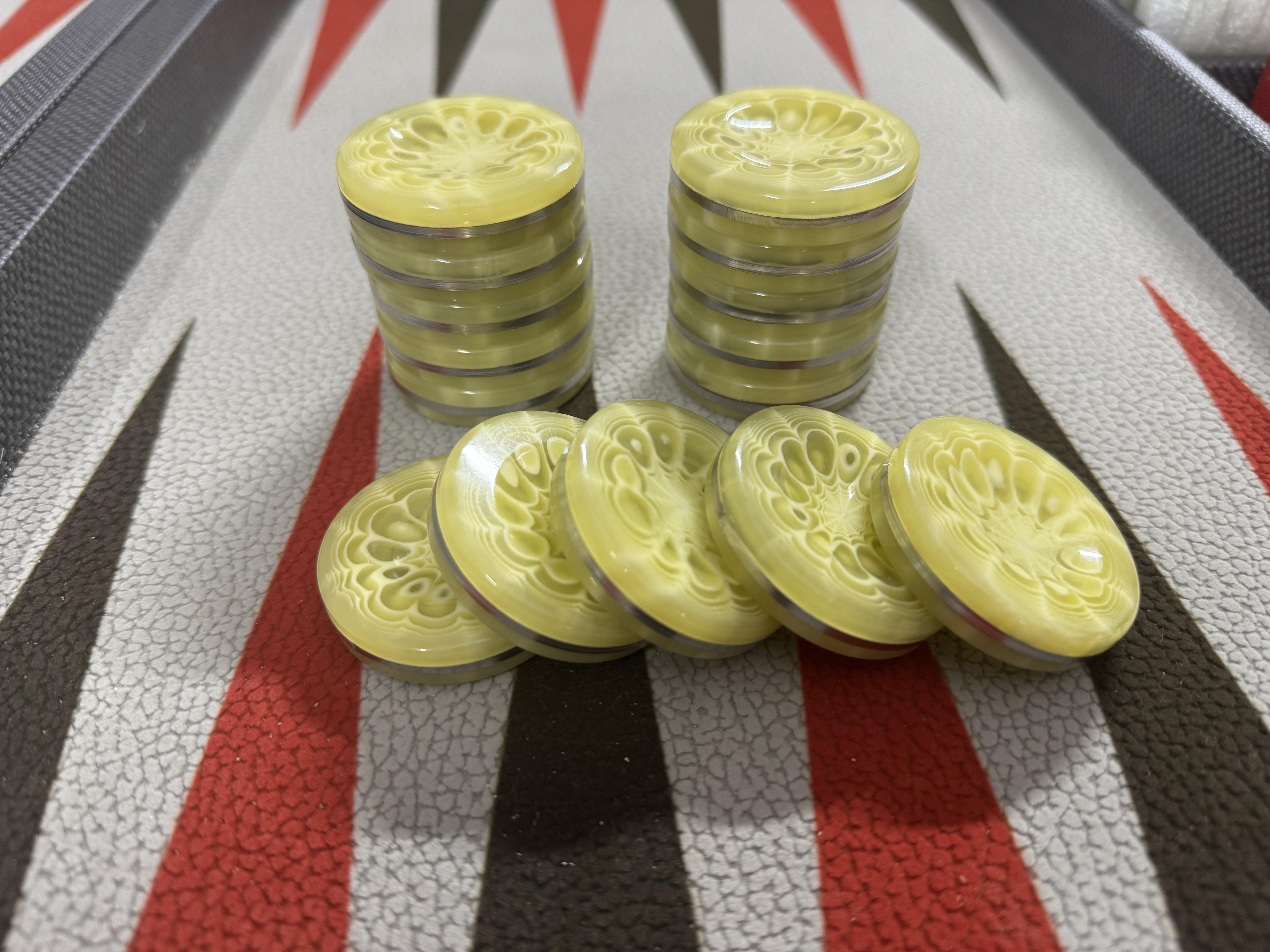 Sandvich Chrome & Polyester Backgammon Checkers 10mm x 44.5mm